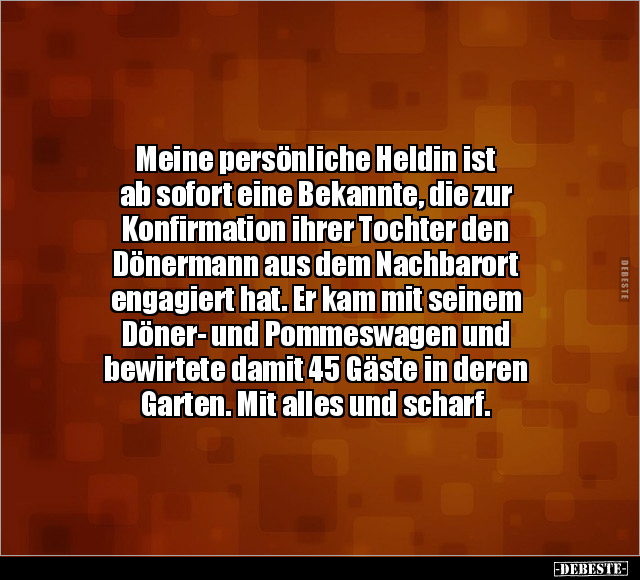 Meine persönliche Heldin ist ab sofort eine Bekannte, die zur Konfirmation ihrer Tochter den Dönermann aus dem Nachbarort engagiert hat. Er kam mit seinem Döner- und Pommeswagen und bewirtete damit 45 Gäste in deren Garten. Mit alles und scharf.