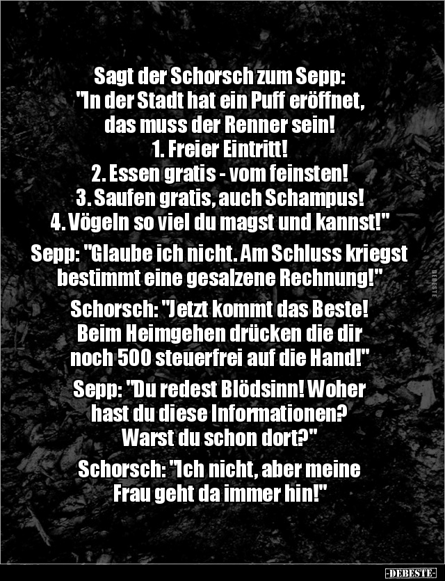 Sagt der Schorsch zum Sepp: "In der Stadt hat ein Puff eröffnet, das muss der Renner sein! 1. Freier Eintritt! 2. Essen gratis - vom feinsten! 3. Saufen gratis, auch Schampus! 4. Vögeln so viel du magst und kannst!" Sepp: "Glaube ich nicht. Am Schluss kriegst bestimmt eine gesalzene Rechnung!" Schorsch: "Jetzt kommt das Beste! Beim Heimgehen drücken die dir noch 500 steuerfrei auf die Hand!" Sepp: "Du redest Blödsinn! Woher hast du diese Informationen? Warst du schon dort?" Schorsch: "Ich nicht, aber meine Frau geht da immer hin!"