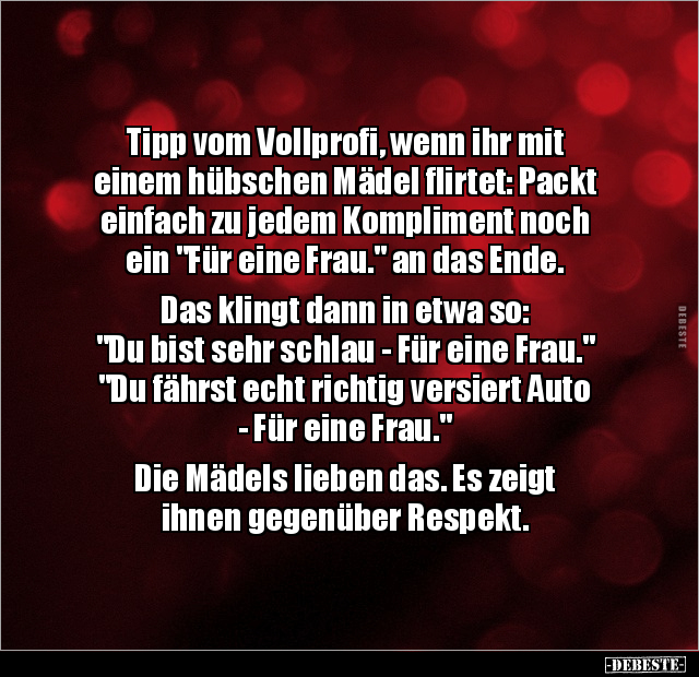 Tipp vom Vollprofi, wenn ihr mit einem hübschen Mädel flirtet: Packt einfach zu jedem Kompliment noch ein "Für eine Frau." an das Ende. Das klingt dann in etwa so: "Du bist sehr schlau - Für eine Frau." "Du fährst echt richtig versiert Auto - Für eine Frau." Die Mädels lieben das. Es zeigt ihnen gegenüber Respekt.