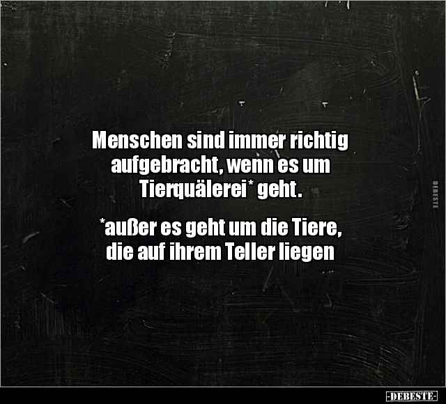 Menschen sind immer richtig aufgebracht, wenn es um Tierquälerei* geht. *außer es geht um die Tiere, die auf ihrem Teller liegen