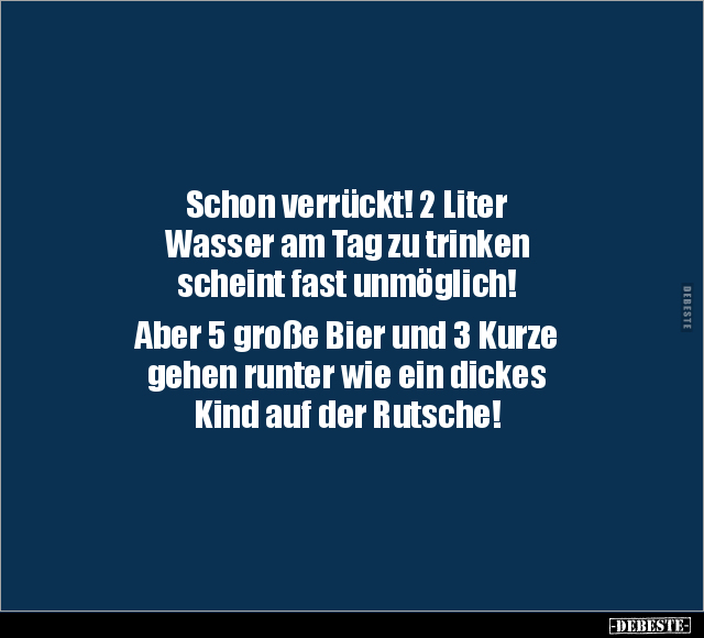 Schon verrückt! 2 Liter Wasser am Tag zu trinken scheint fast unmöglich! Aber 5 große Bier und 3 Kurze gehen runter wie ein dickes Kind auf der Rutsche!
