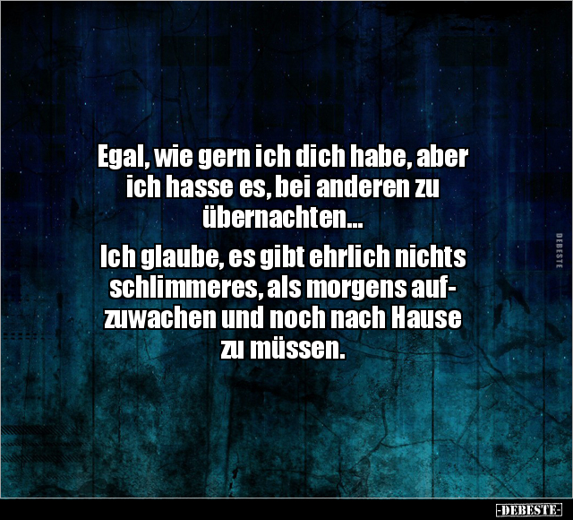 Egal, wie gern ich dich habe, aber ich hasse es, bei anderen zu übernachten... Ich glaube, es gibt ehrlich nichts schlimmeres, als morgens auf- zuwachen und noch nach Hause zu müssen.