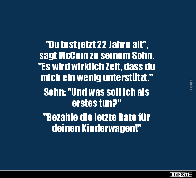 "Du bist jetzt 22 Jahre alt", sagt McCoin zu seinem Sohn. "Es wird wirklich Zeit, dass du mich ein wenig unterstützt." Sohn: "Und was soll ich als erstes tun?" "Bezahle die letzte Rate für deinen Kinderwagen!"