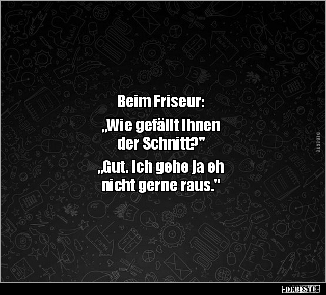 Beim Friseur: „Wie gefällt Ihnen der Schnitt?" „Gut. Ich gehe ja eh nicht gerne raus."
