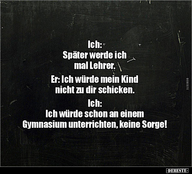 Ich: Später werde ich mal Lehrer. Er: Ich würde mein Kind nicht zu dir schicken. Ich: Ich würde schon an einem Gymnasium unterrichten, keine Sorge!