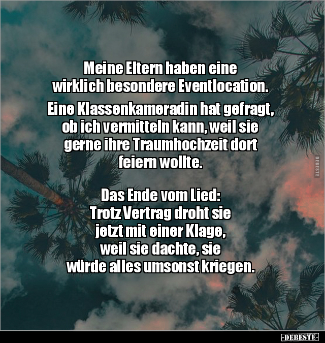 Meine Eltern haben eine wirklich besondere Eventlocation. Eine Klassenkameradin hat gefragt, ob ich vermitteln kann, weil sie gerne ihre Traumhochzeit dort feiern wollte. Das Ende vom Lied: Trotz Vertrag droht sie jetzt mit einer Klage, weil sie dachte, sie würde alles umsonst kriegen.