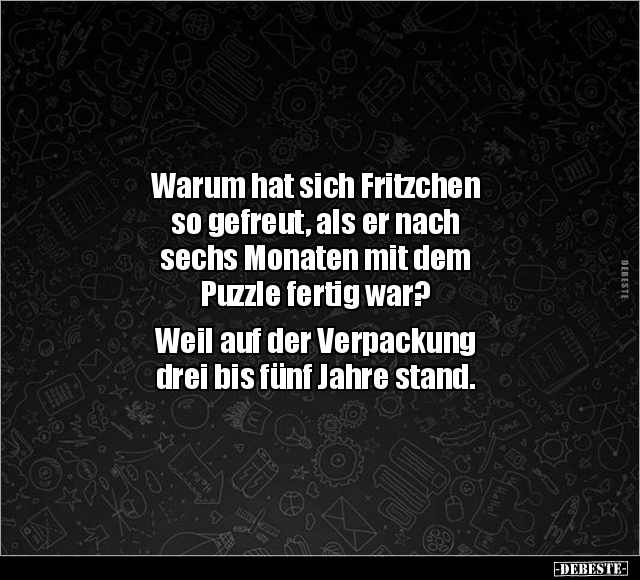 Warum hat sich Fritzchen so gefreut, als er nach sechs Monaten mit dem Puzzle fertig war? Weil auf der Verpackung drei bis fünf Jahre stand.
