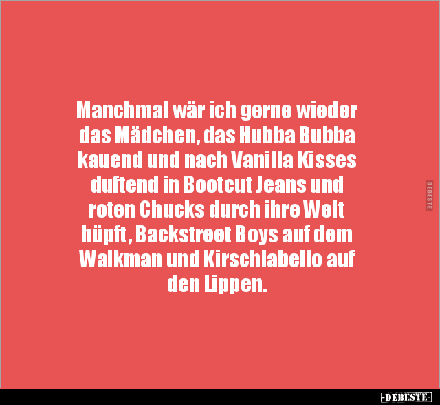 Manchmal wär ich gerne wieder das Mädchen, das Hubba Bubba kauend und nach Vanilla Kisses duftend in Bootcut Jeans und roten Chucks durch ihre Welt hüpft, Backstreet Boys auf dem Walkman und Kirschlabello auf den Lippen.
