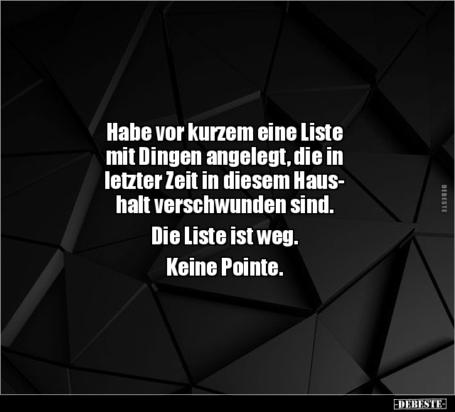 Habe vor kurzem eine Liste mit Dingen angelegt, die in letzter Zeit in diesem Haus- halt verschwunden sind. Die Liste ist weg. Keine Pointe.