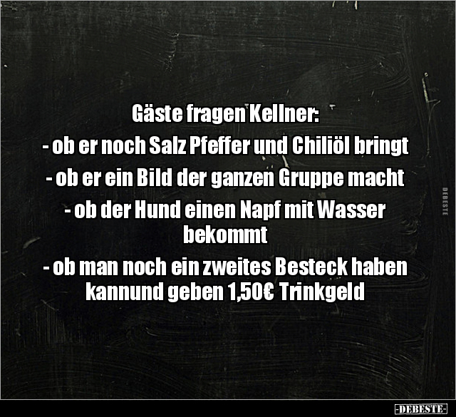 Gäste fragen Kellner: - ob er noch Salz Pfeffer und Chiliöl bringt - ob er ein Bild der ganzen Gruppe macht - ob der Hund einen Napf mit Wasser bekommt - ob man noch ein zweites Besteck haben kannund geben 1,50€ Trinkgeld