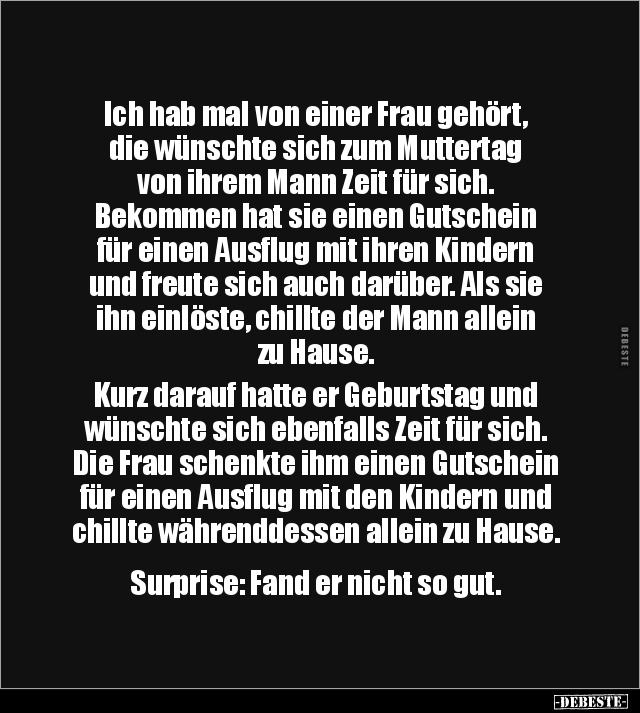 Ich hab mal von einer Frau gehört, die wünschte sich zum Muttertag von ihrem Mann Zeit für sich. Bekommen hat sie einen Gutschein für einen Ausflug mit ihren Kindern und freute sich auch darüber. Als sie ihn einlöste, chillte der Mann allein zu Hause. Kurz darauf hatte er Geburtstag und wünschte sich ebenfalls Zeit für sich. Die Frau schenkte ihm einen Gutschein für einen Ausflug mit den Kindern und chillte währenddessen allein zu Hause. Surprise: Fand er nicht so gut.