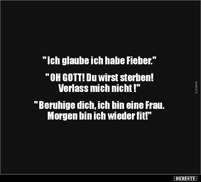 " Ich glaube ich habe Fieber." " OH GOTT! Du wirst sterben! Verlass mich nicht !" " Beruhige dich, ich bin eine Frau. Morgen bin ich wieder fit!"