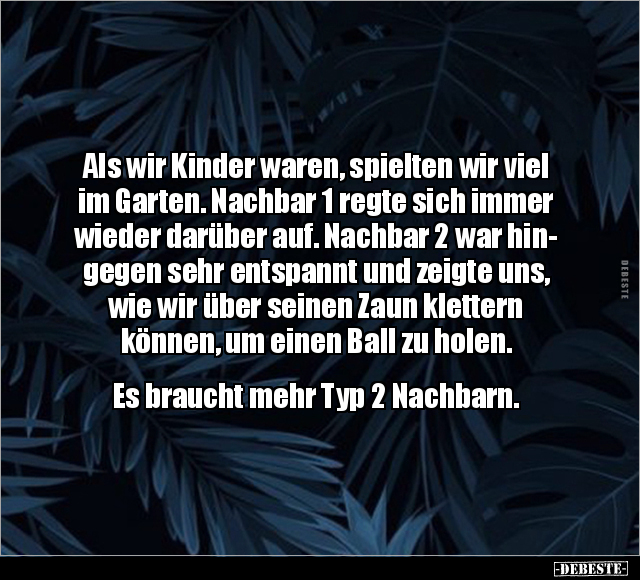 Als wir Kinder waren, spielten wir viel im Garten. Nachbar 1 regte sich immer wieder darüber auf. Nachbar 2 war hin- gegen sehr entspannt und zeigte uns, wie wir über seinen Zaun klettern können, um einen Ball zu holen. Es braucht mehr Typ 2 Nachbarn.