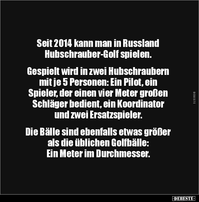 Seit 2014 kann man in Russland Hubschrauber-Golf spielen. Gespielt wird in zwei Hubschraubern mit je 5 Personen: Ein Pilot, ein Spieler, der einen vier Meter großen Schläger bedient, ein Koordinator und zwei Ersatzspieler. Die Bälle sind ebenfalls etwas größer als die üblichen Golfbälle: Ein Meter im Durchmesser.