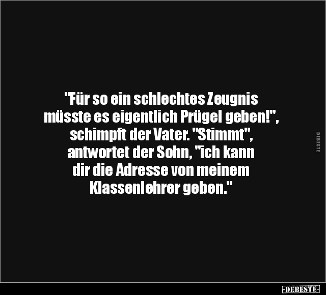 "Für so ein schlechtes Zeugnis müsste es eigentlich Prügel geben!", schimpft der Vater. "Stimmt", antwortet der Sohn, "ich kann dir die Adresse von meinem Klassenlehrer geben."
