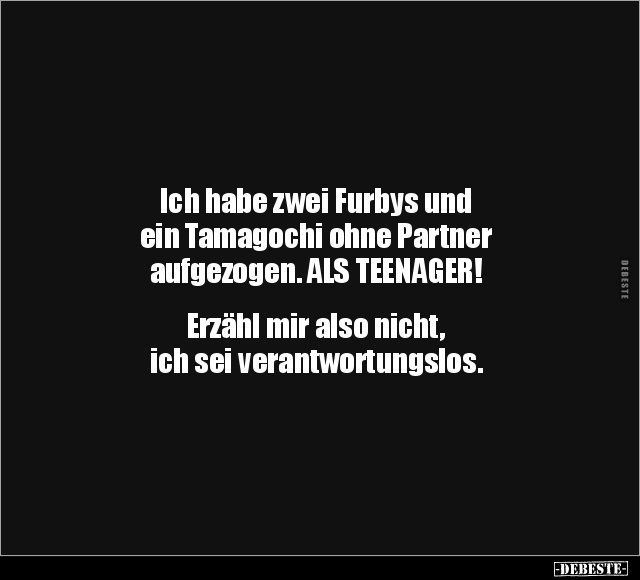 Ich habe zwei Furbys und ein Tamagochi ohne Partner aufgezogen. ALS TEENAGER! Erzähl mir also nicht, ich sei verantwortungslos.