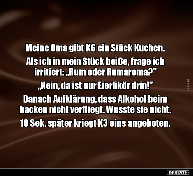 Meine Oma gibt K6 ein Stück Kuchen. Als ich in mein Stück beiße, frage ich irritiert: „Rum oder Rumaroma?” „Nein, da ist nur Eierlikör drin!” Danach Aufklärung, dass Alkohol beim backen nicht verfliegt. Wusste sie nicht. 10 Sek. später kriegt K3 eins angeboten.