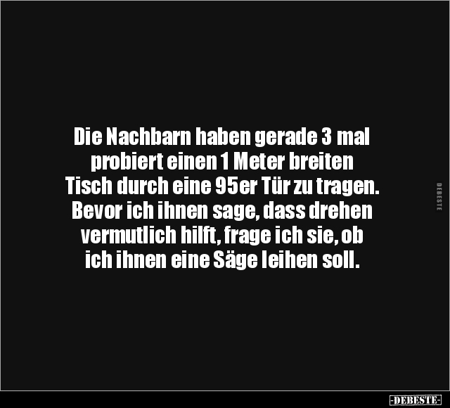 Die Nachbarn haben gerade 3 mal probiert einen 1 Meter breiten Tisch durch eine 95er Tür zu tragen. Bevor ich ihnen sage, dass drehen vermutlich hilft, frage ich sie, ob ich ihnen eine Säge leihen soll.