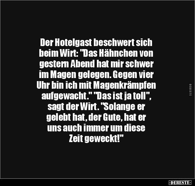 Der Hotelgast beschwert sich beim Wirt: "Das Hähnchen von gestern Abend hat mir schwer im Magen gelegen. Gegen vier Uhr bin ich mit Magenkrämpfen aufgewacht." "Das ist ja toll", sagt der Wirt. "Solange er gelebt hat, der Gute, hat er uns auch immer um diese Zeit geweckt!"