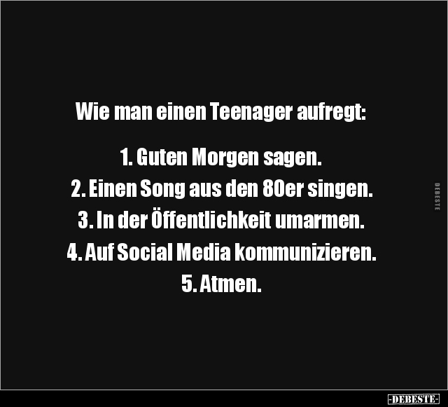 Wie man einen Teenager aufregt: 1. Guten Morgen sagen. 2. Einen Song aus den 80er singen. 3. In der Öffentlichkeit umarmen. 4. Auf Social Media kommunizieren. 5. Atmen.