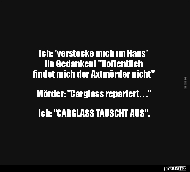 Ich: *verstecke mich im Haus* (in Gedanken) "Hoffentlich findet mich der Axtmörder nicht" Mörder: "Carglass repariert. . ." Ich: "CARGLASS TAUSCHT AUS".
