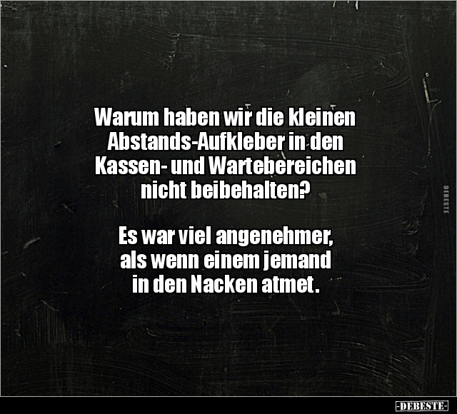 Warum haben wir die kleinen Abstands-Aufkleber in den Kassen- und Wartebereichen nicht beibehalten? Es war viel angenehmer, als wenn einem jemand in den Nacken atmet.