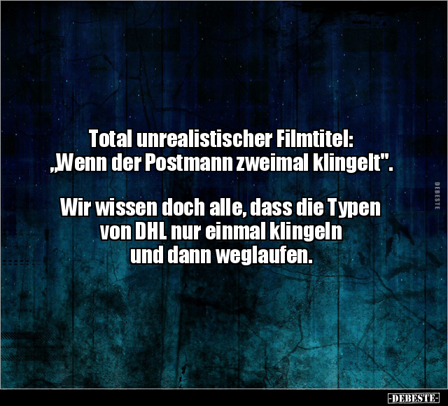 Total unrealistischer Filmtitel: „Wenn der Postmann zweimal klingelt". Wir wissen doch alle, dass die Typen von DHL nur einmal klingeln und dann weglaufen.