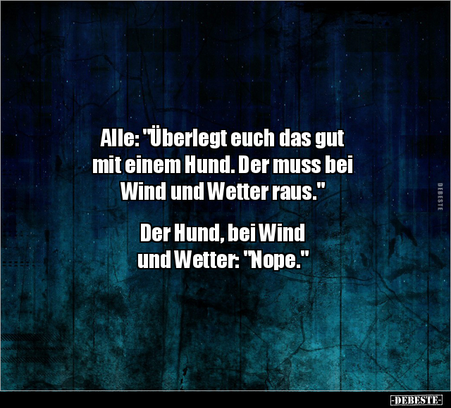 Alle: "Überlegt euch das gut mit einem Hund. Der muss bei Wind und Wetter raus." Der Hund, bei Wind und Wetter: "Nope."