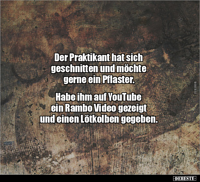 Der Praktikant hat sich geschnitten und möchte gerne ein Pflaster. Habe ihm auf YouTube ein Rambo Video gezeigt und einen Lötkolben gegeben.