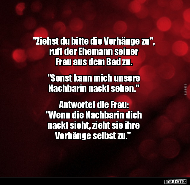 "Ziehst du bitte die Vorhänge zu", ruft der Ehemann seiner Frau aus dem Bad zu. "Sonst kann mich unsere Nachbarin nackt sehen." Antwortet die Frau: "Wenn die Nachbarin dich nackt sieht, zieht sie ihre Vorhänge selbst zu."