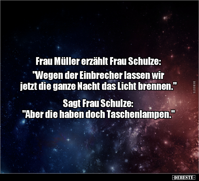 Frau Müller erzählt Frau Schulze: "Wegen der Einbrecher lassen wir jetzt die ganze Nacht das Licht brennen." Sagt Frau Schulze: "Aber die haben doch Taschenlampen."