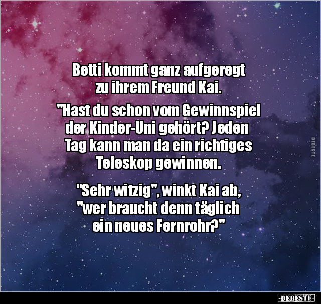 Betti kommt ganz aufgeregt zu ihrem Freund Kai. "Hast du schon vom Gewinnspiel der Kinder-Uni gehört? Jeden Tag kann man da ein richtiges Teleskop gewinnen. "Sehr witzig", winkt Kai ab, "wer braucht denn täglich ein neues Fernrohr?"