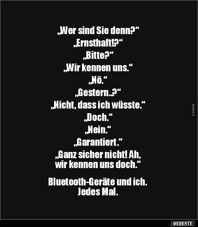 „Wer sind Sie denn?“ „Ernsthaft!?“ „Bitte?“ „Wir kennen uns.“ „Nö.“ „Gestern..?“ „Nicht, dass ich wüsste.“ „Doch.“ „Nein.“ „Garantiert.“ „Ganz sicher nicht! Ah, wir kennen uns doch.“ Bluetooth-Geräte und ich. Jedes Mal.