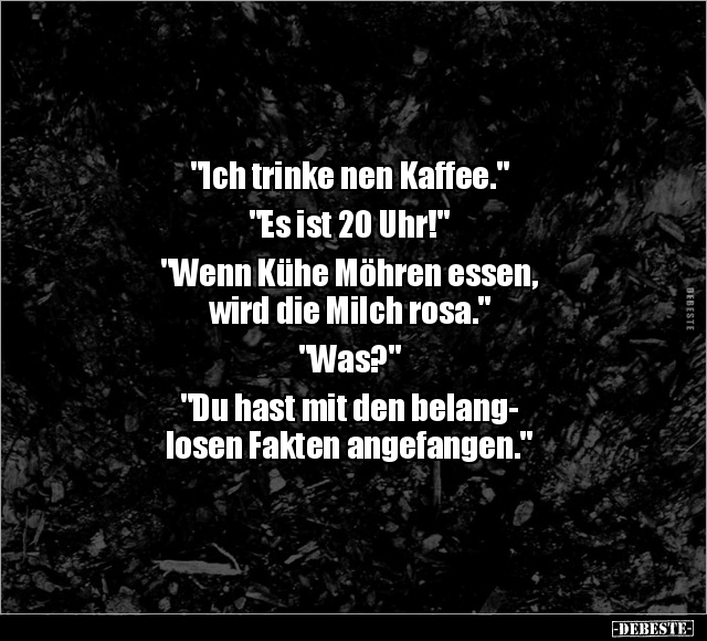 "Ich trinke nen Kaffee." "Es ist 20 Uhr!" "Wenn Kühe Möhren essen, wird die Milch rosa." "Was?" "Du hast mit den belang- losen Fakten angefangen."