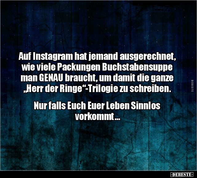 Auf Instagram hat jemand ausgerechnet, wie viele Packungen Buchstabensuppe man GENAU braucht, um damit die ganze „Herr der Ringe“-Trilogie zu schreiben. Nur falls Euch Euer Leben Sinnlos vorkommt…