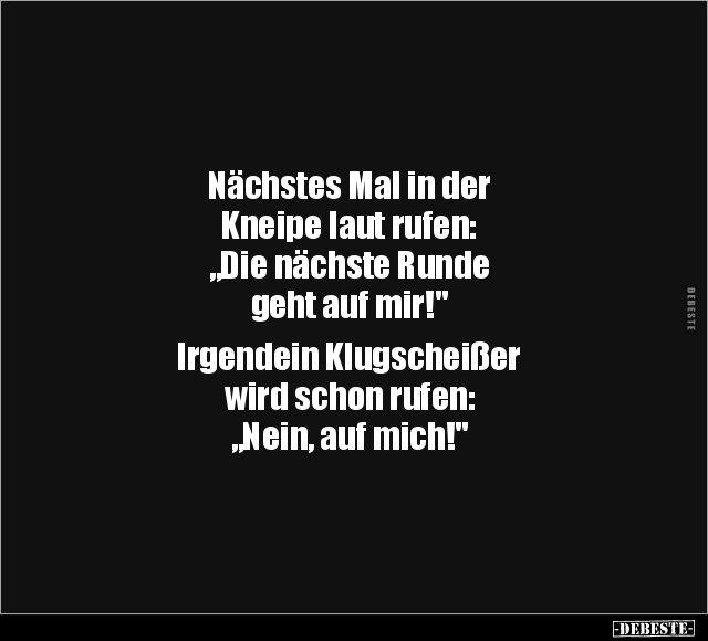 Nächstes Mal in der Kneipe laut rufen: „Die nächste Runde geht auf mir!" Irgendein Klugscheißer wird schon rufen: „Nein, auf mich!"