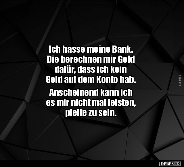 Ich hasse meine Bank. Die berechnen mir Geld dafür, dass ich kein Geld auf dem Konto hab. Anscheinend kann ich es mir nicht mal leisten, pleite zu sein.