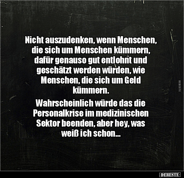 Nicht auszudenken, wenn Menschen, die sich um Menschen kümmern, dafür genauso gut entlohnt und geschätzt werden würden, wie Menschen, die sich um Geld kümmern. Wahrscheinlich würde das die Personalkrise im medizinischen Sektor beenden, aber hey, was weiß ich schon...