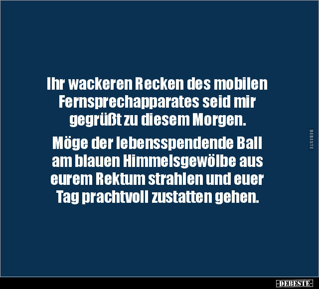 Ihr wackeren Recken des mobilen Fernsprechapparates seid mir gegrüßt zu diesem Morgen. Möge der lebensspendende Ball am blauen Himmelsgewölbe aus eurem Rektum strahlen und euer Tag prachtvoll zustatten gehen.
