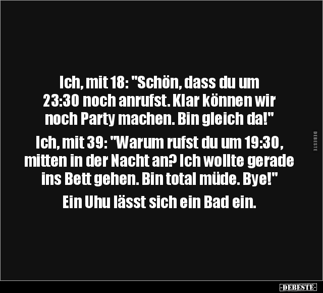 Ich, mit 18: "Schön, dass du um 23:30 noch anrufst. Klar können wir noch Party machen. Bin gleich da!" Ich, mit 39: "Warum rufst du um 19:30, mitten in der Nacht an? Ich wollte gerade ins Bett gehen. Bin total müde. Bye!" Ein Uhu lässt sich ein Bad ein.