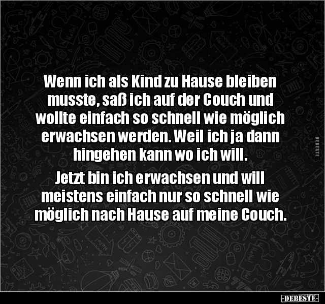 Wenn ich als Kind zu Hause bleiben musste, saß ich auf der Couch und wollte einfach so schnell wie möglich erwachsen werden. Weil ich ja dann hingehen kann wo ich will. Jetzt bin ich erwachsen und will meistens einfach nur so schnell wie möglich nach Hause auf meine Couch.