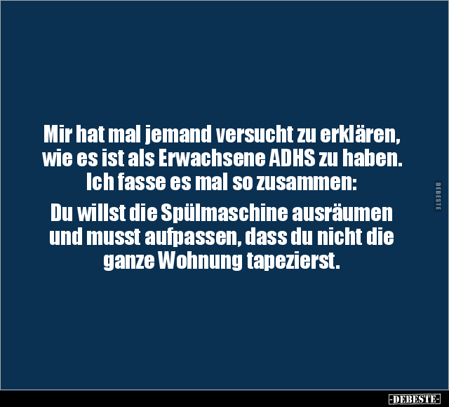 Mir hat mal jemand versucht zu erklären, wie es ist als Erwachsene ADHS zu haben. Ich fasse es mal so zusammen: Du willst die Spülmaschine ausräumen und musst aufpassen, dass du nicht die ganze Wohnung tapezierst.