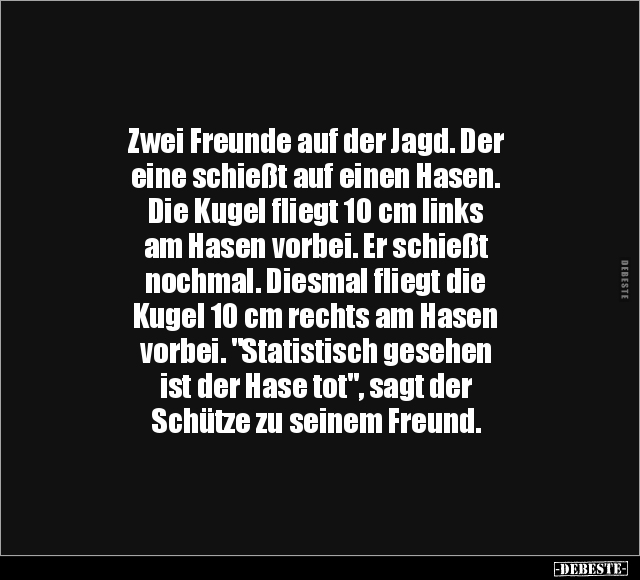 Zwei Freunde auf der Jagd. Der eine schießt auf einen Hasen. Die Kugel fliegt 10 cm links am Hasen vorbei. Er schießt nochmal. Diesmal fliegt die Kugel 10 cm rechts am Hasen vorbei. "Statistisch gesehen ist der Hase tot", sagt der Schütze zu seinem Freund.