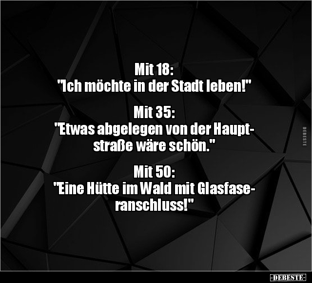 Mit 18: "Ich möchte in der Stadt leben!" Mit 35: "Etwas abgelegen von der Haupt- straße wäre schön." Mit 50: "Eine Hütte im Wald mit Glasfase- ranschluss!"