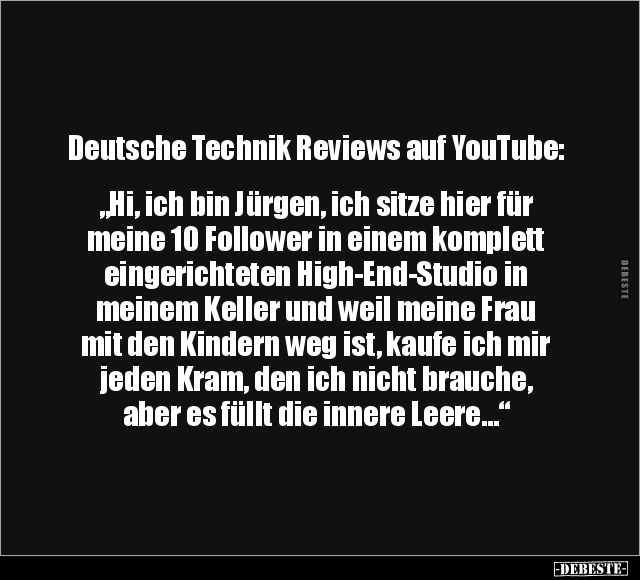 Deutsche Technik Reviews auf YouTube: „Hi, ich bin Jürgen, ich sitze hier für meine 10 Follower in einem komplett eingerichteten High-End-Studio in meinem Keller und weil meine Frau mit den Kindern weg ist, kaufe ich mir jeden Kram, den ich nicht brauche, aber es füllt die innere Leere…“