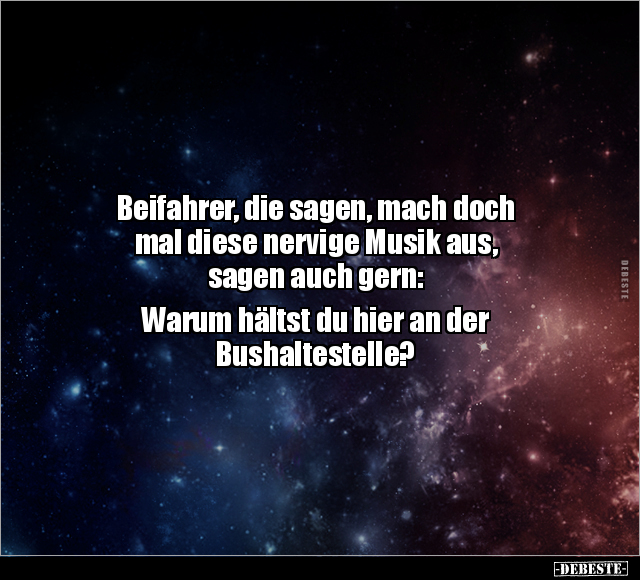Beifahrer, die sagen, mach doch mal diese nervige Musik aus, sagen auch gern: Warum hältst du hier an der Bushaltestelle?