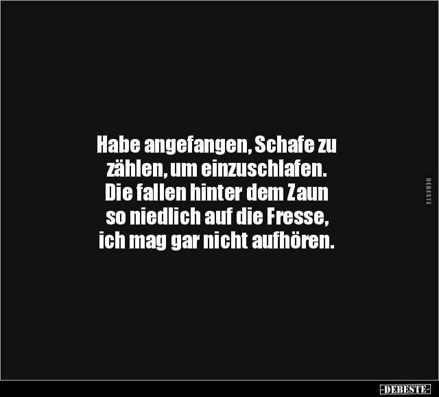 Habe angefangen, Schafe zu zählen, um einzuschlafen. Die fallen hinter dem Zaun so niedlich auf die Fresse, ich mag gar nicht aufhören.