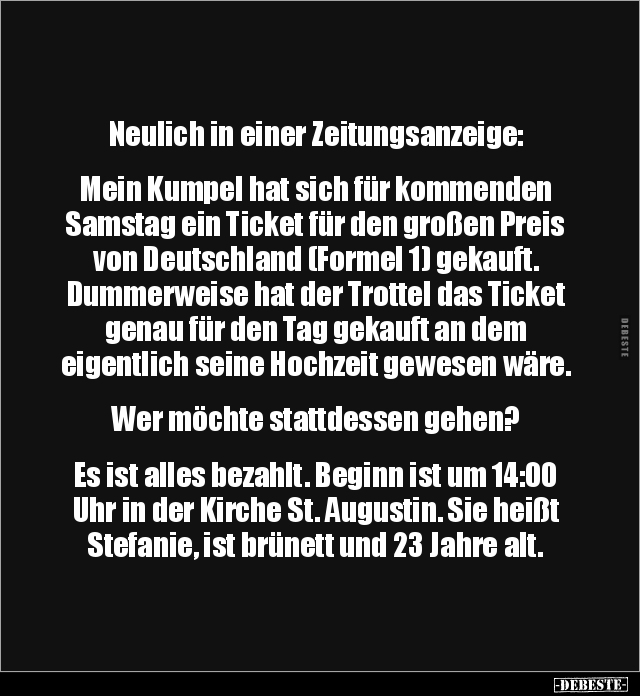 Neulich in einer Zeitungsanzeige: Mein Kumpel hat sich für kommenden Samstag ein Ticket für den großen Preis von Deutschland (Formel 1) gekauft. Dummerweise hat der Trottel das Ticket genau für den Tag gekauft an dem eigentlich seine Hochzeit gewesen wäre. Wer möchte stattdessen gehen? Es ist alles bezahlt. Beginn ist um 14:00 Uhr in der Kirche St. Augustin. Sie heißt Stefanie, ist brünett und 23 Jahre alt.