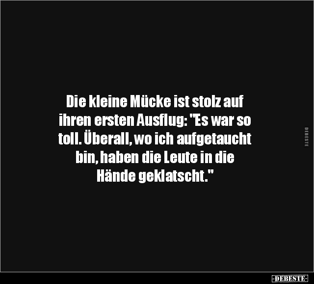 Die kleine Mücke ist stolz auf ihren ersten Ausflug: "Es war so toll. Überall, wo ich aufgetaucht bin, haben die Leute in die Hände geklatscht."