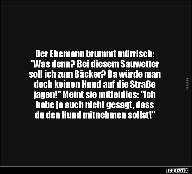 Der Ehemann brummt mürrisch: "Was denn? Bei diesem Sauwetter soll ich zum Bäcker? Da würde man doch keinen Hund auf die Straße jagen!" Meint sie mitleidlos: "Ich habe ja auch nicht gesagt, dass du den Hund mitnehmen sollst!"